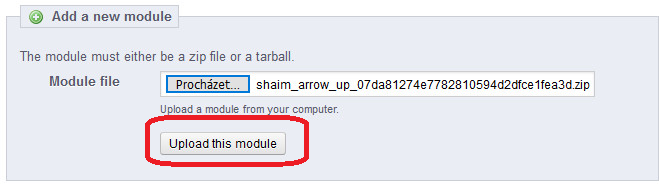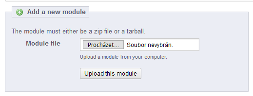 Na stránce se zobrazí box s políčkem pro výběr souboru s modulem. Vyberte ZIP soubor, který chcete nahrát a stiskněte tlačítko Nahrát tento modul. Modul nahrajte tak, jak ho obdržíte od nás, případně jiného dodavatele – ve formátu ZIP. Nerozbalujte ho, neměňte ho. Pro kontrolu nahlédněte do ZIP souboru a měla by tam být pouze jediná složka a v ní soubory PHP a další daného modulu.