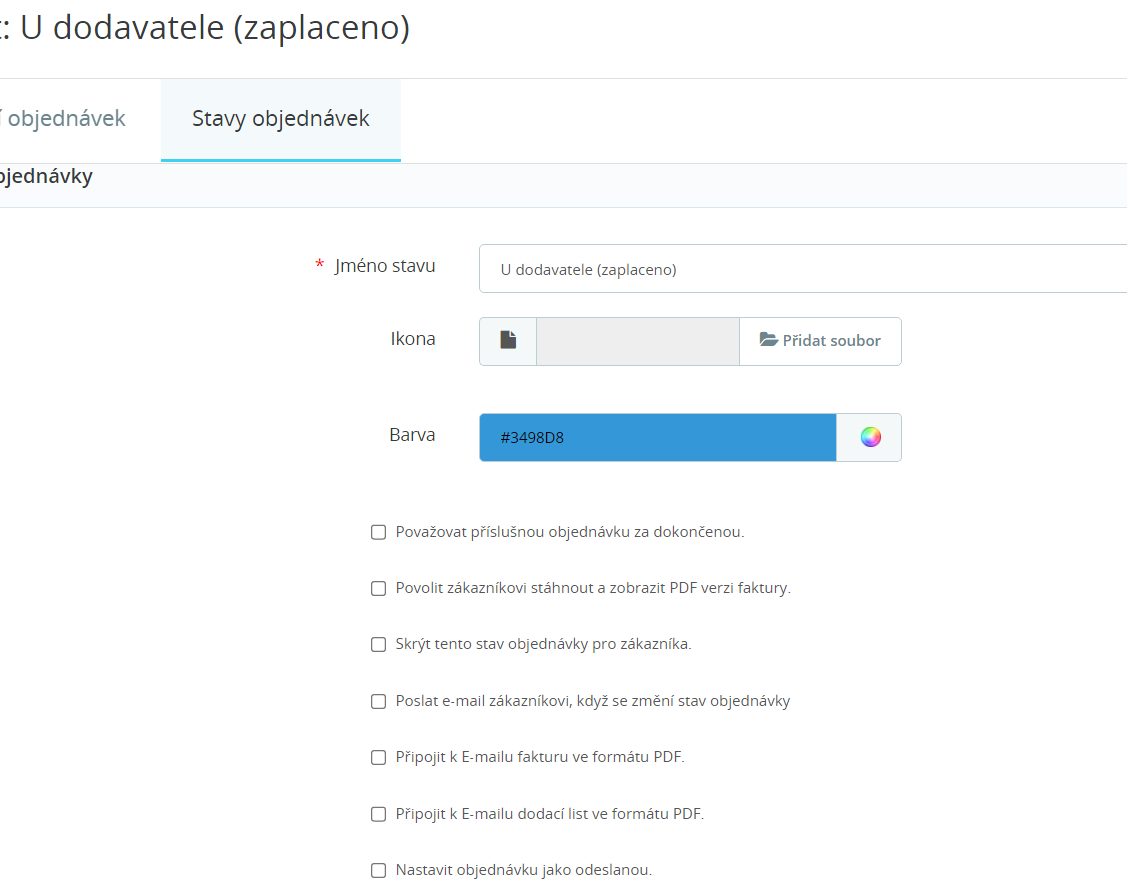 Pokud byste chtěli, aby se stavy dále nastavovaly, ale zákazník je neviděl, není třeba upravovat soubor na FTP, ale v editaci toho příslušného stavu (stavů)¨nastavte volbu „Skrýt tento stav objednávky pro zákazníka.“. Tím sice dojde ke změně stavu jako doposud, ale zákazník tento stav neuvidí. Zároveň odškrtnout volbu „Poslat e-mail zákazníkovi, když se změní stav objednávky“, aby zákazníkovi nepřišel ještě e-mail. Toto je konfigurovatelné u editace příslušného stavu.