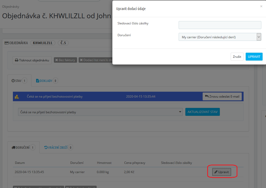 V administraci v detailu objednávky klikem na tl. upravit