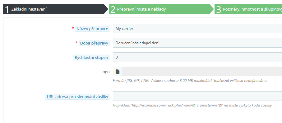 klikem na upravit u dopravce se otevře panel a zde doplníme url adresu pro sledování zásilky