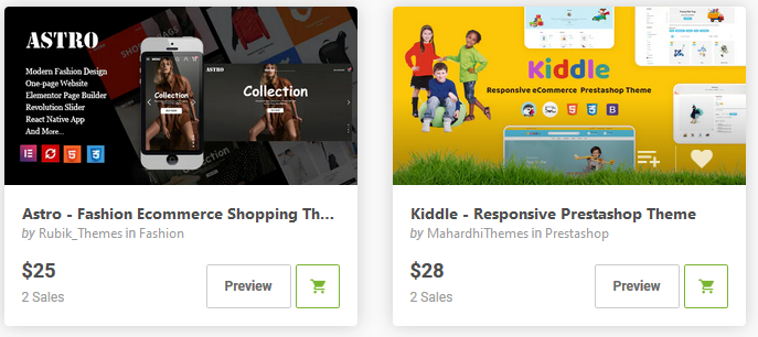 Na rozdíl od Leotheme není ThemeForest tvůrcem šablon ale jen prodejcem. Zaměřuje se především na WordPress ale i přesto zde najdete přes 1000 šablon pro PrestaShop, dokonce i pro verzi 1.4. Samozřejmostí je podpora PrestaShopu 1.7. Výhodou je cena šablon, kdy šablony v akci se pohybují okolo 25 dolarů a více než polovina je s cenou pod 49 dolarů. Nabízejí také moduly pro PrestaShop.