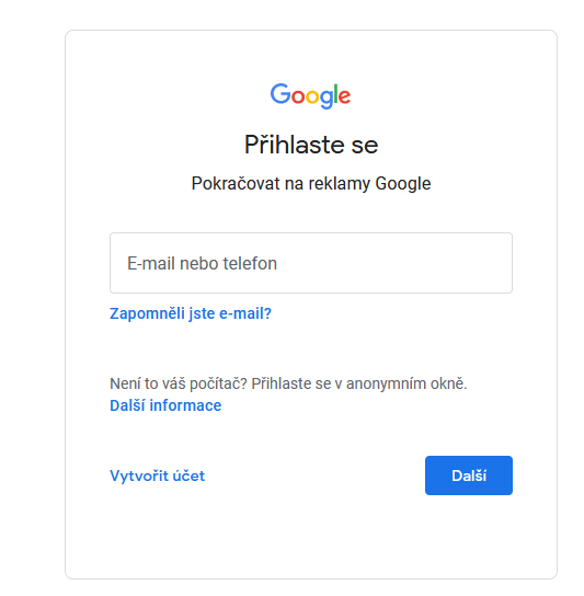 Přejdeme na stránku Google Ads a přihlásíme se účtem od google