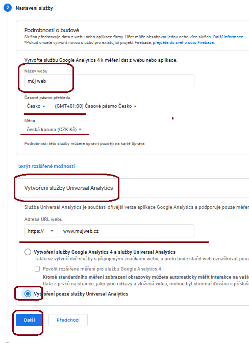 zapneme službu Universal Analytics a nastavíme adresu webu, zvolíme Vytvoření pouze služby Universal Analytics