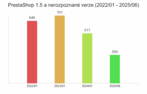 PS 1.6 – Zde je vidět obrovský pokles počtu e-shopů, opět to je dáno tím, že hodně lidí aktualizovalo na novější verzi 1.7. a 8.x. Zároveň také přirozeným úbytkem vlivem konkurence na CZ trhu a zároveň příchodu velkých zahraničních hráčů (levná tržiště).