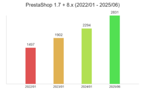 PS 1.7 / 8.x – Stejně jako u 1.6, platí vše uvedené, zde je nárůst způsobený hlavně přechodem z 1.6ky, samozřejmě nějaké e-shopy skončily, ale převážně se jedná o starší 1.6ky, které šly do věčných lovišť – o důvod víc, proč je nutno aktualizovat PrestaShop a nezaspat dobu.