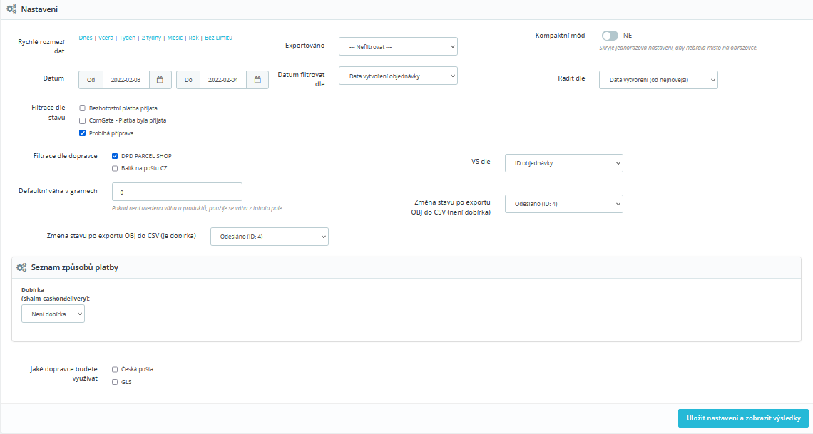 nejprve nastavíte dopravce a stav, kdy se má zásilka odesílat