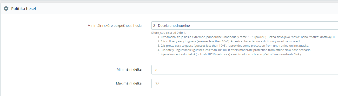 Tato volba se nachází v adminu PS v sekci „Nástroje“ -> „Security“ -> „Politika hesel“ a zde můžete nastavit minimální a maximální délku hesla + „Minimální skóre bezpečnosti hesla“. Toto nastavení říká, jak složité heslo musí být, jestli musí mít nějaké speciální znaky apod.