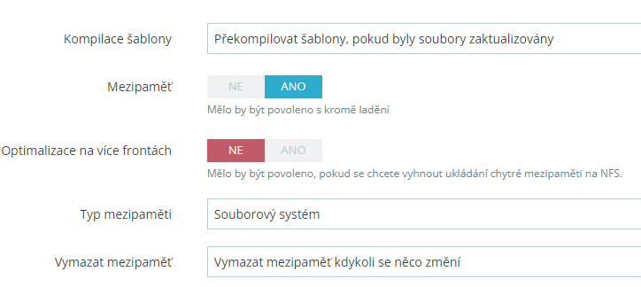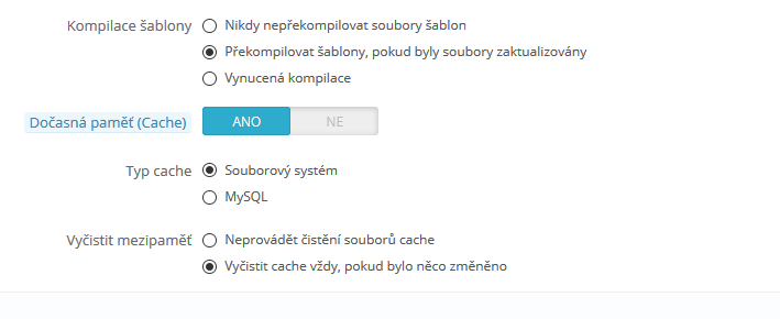 Ideální nastavení kompilace šablony a dočasné paměti je na obrázku. Pokud v eshopu neděláte změny týkající se vzhledu, doporučuji volbu „Vyčistit mezipaměť“ nastavit na Neprovádět čistění souborů cache. V případě potřeby lze obsah dočasné paměti smazat ručne klikem na tlačítko „Vyčistit mezipaměť“ v pravé horní části stránky.