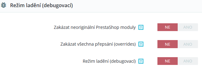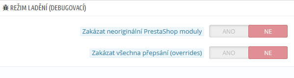 Tato sekce nemá na výkon eshopu žádný vliv, používá se při ladění chyb. Zakázáním jednoduše vyloučíte nebo potvrdíte souvislost problému s některým z modulů třetích stran nebo přepsáním. Jelikož se obě volby používají jen při ladění aplikace. U verze PrestaShop 1.7 se zde také zapíná ladící mód pro programátory. Ponechte všechny na NE.