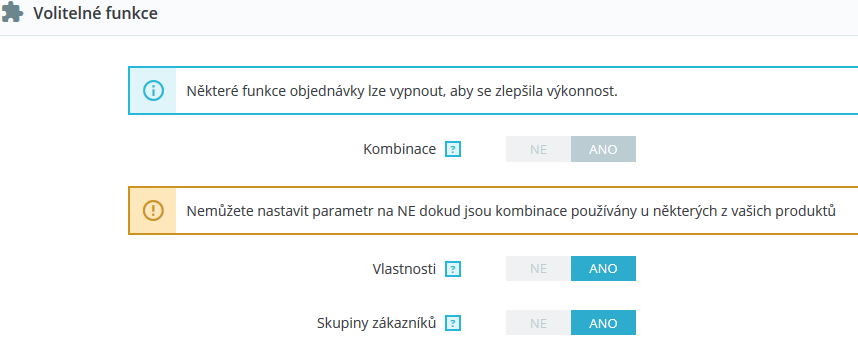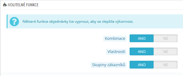 Eshop můžete zrychlit vypnutím nepotřebných funkcí. Pokud nepoužíváte kombinace nebo vlastnosti produktů a nebo skupiny zákazníků, deaktivujte je přepnutím na NE