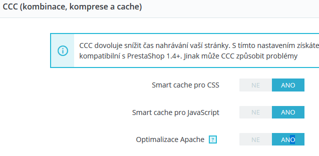 Zde 3x pozor, mnoho e-shopařů používá volbu „Kompilace šablony“ -> „Nikdy nepřekomplikovat soubory šablon“ ve snaze urychlit PrestaShop. Toto sice dává smysl, jenže problém je v tom, že z naší praxe se poté někdy cache smazat musí, např. z důvodu úprav a mnohokrát se nám již stalo, že smazáním a načtení nové cache přestal e-shop úplně fungovat a museli jsme zjišťovat co se tam třeba před půl rokem stalo (ideálně když tam zrovna zasahovali jiní vývojáři) – lahůdka opravdu.