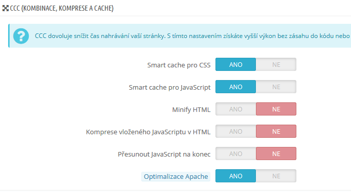 V administraci PrestaShopu přejděte do sekce Nástroje > Výkon a dále postupujte podle jednotlivých částí