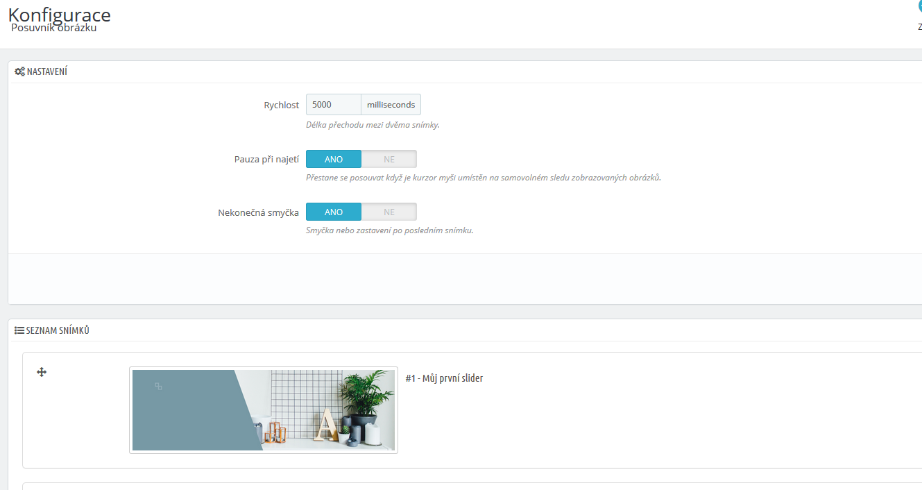 V administraci si otevřeme konfiguraci modulu, který chceme do rychlého přístupu přidat v naší ukázce je to modul posuvníku obrázků na úvodní stránce
