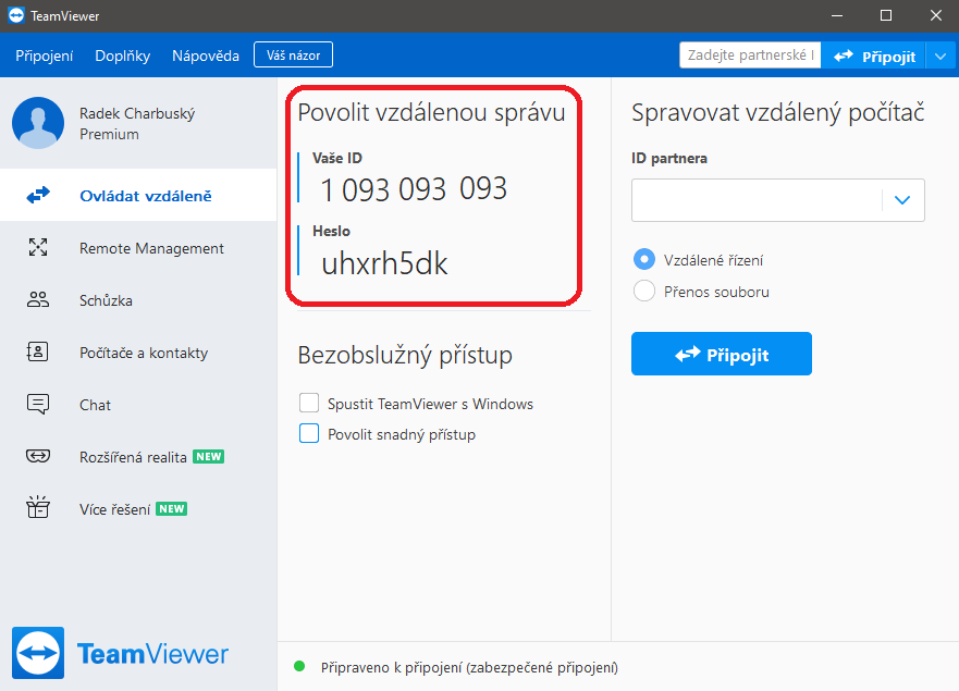 Po spuštění programu předáme partnerovi číslo Vaše ID a heslo z důvodu bezpečnosti se po každém vypnutí a znovuspuštění programu vygeneruje nové heslo. Nemusíte se obávat, že by se někdo připojil znovu bez Vašeho vědomí.
