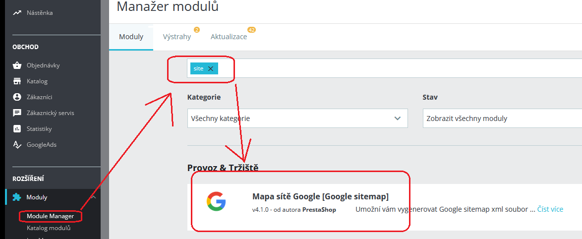 V menu přejdeme do Manažeru modulů, a vyhledáme frázi „site“