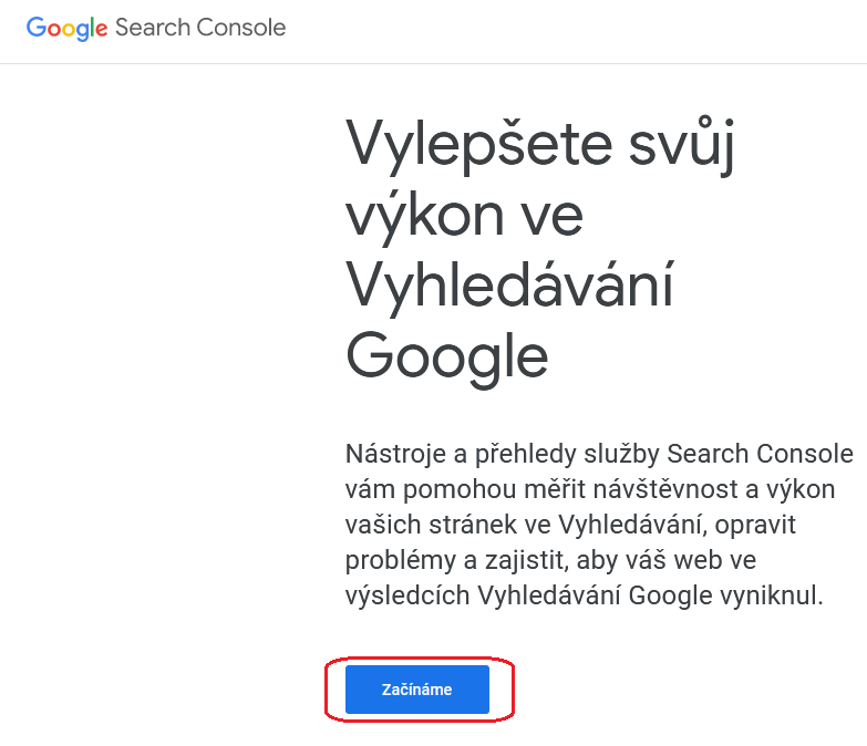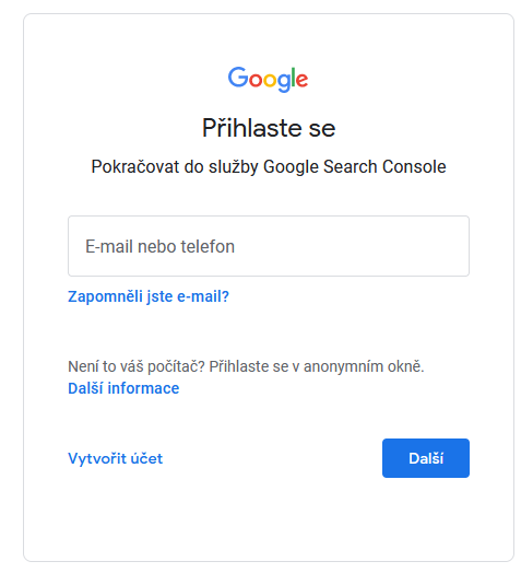 Nejprve se přihlásíme do Google Search Console. pomocí účtu google.
