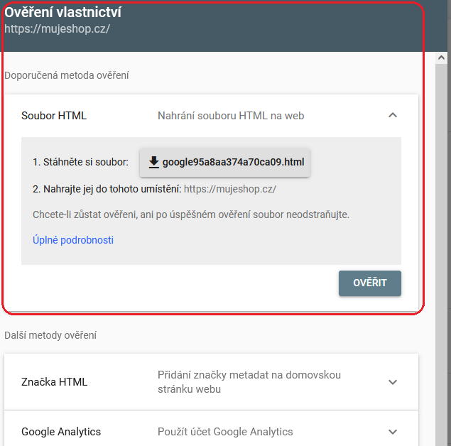 Ověříme dle pokynů, stažený soubor nahrajeme na ftp a ověříme. Případně je možno ověřit doménu i přes DNS záznamy.